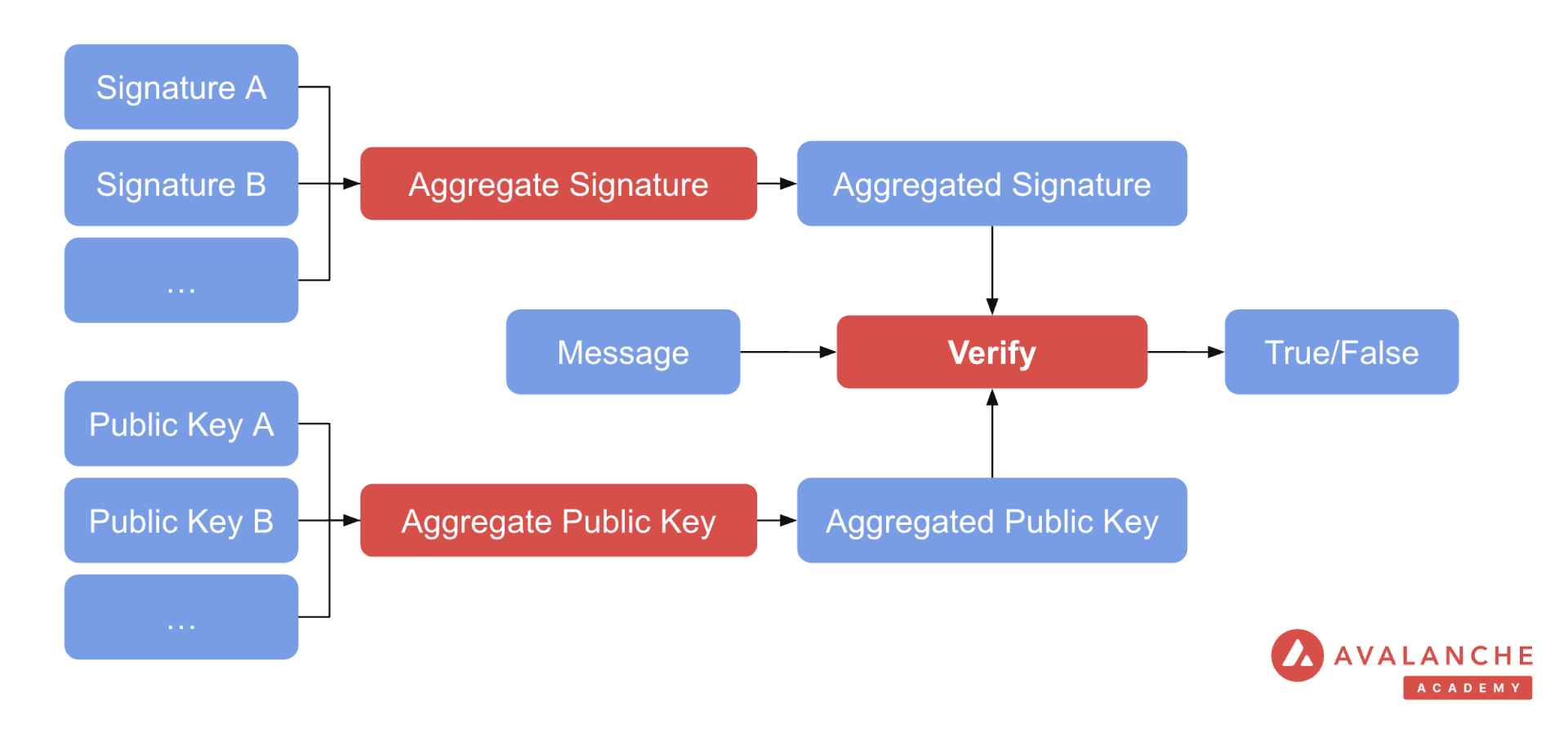 Signature and public key aggregation combines multiple signatures of the same message into a single short signature, which makes transportation and verification much more efficient.